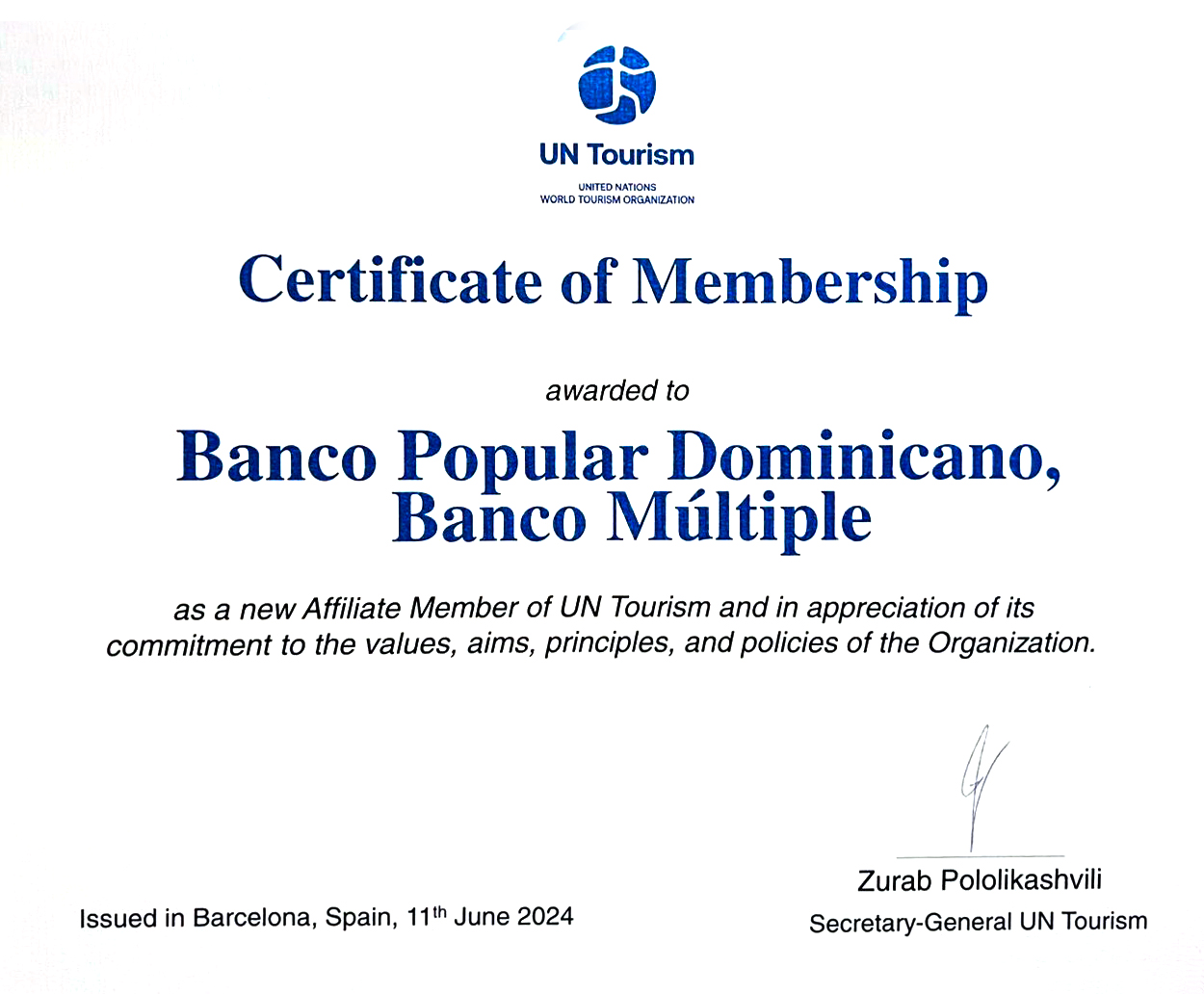Barcelona, España. – El Banco Popular Dominicano se convirtió en miembro afiliado de la Organización Mundial del Turismo (ONU Turismo), una incorporación que incrementará la competitividad y apoyo estratégico que ofrece la entidad bancaria al desarrollo del turismo en la República Dominicana.