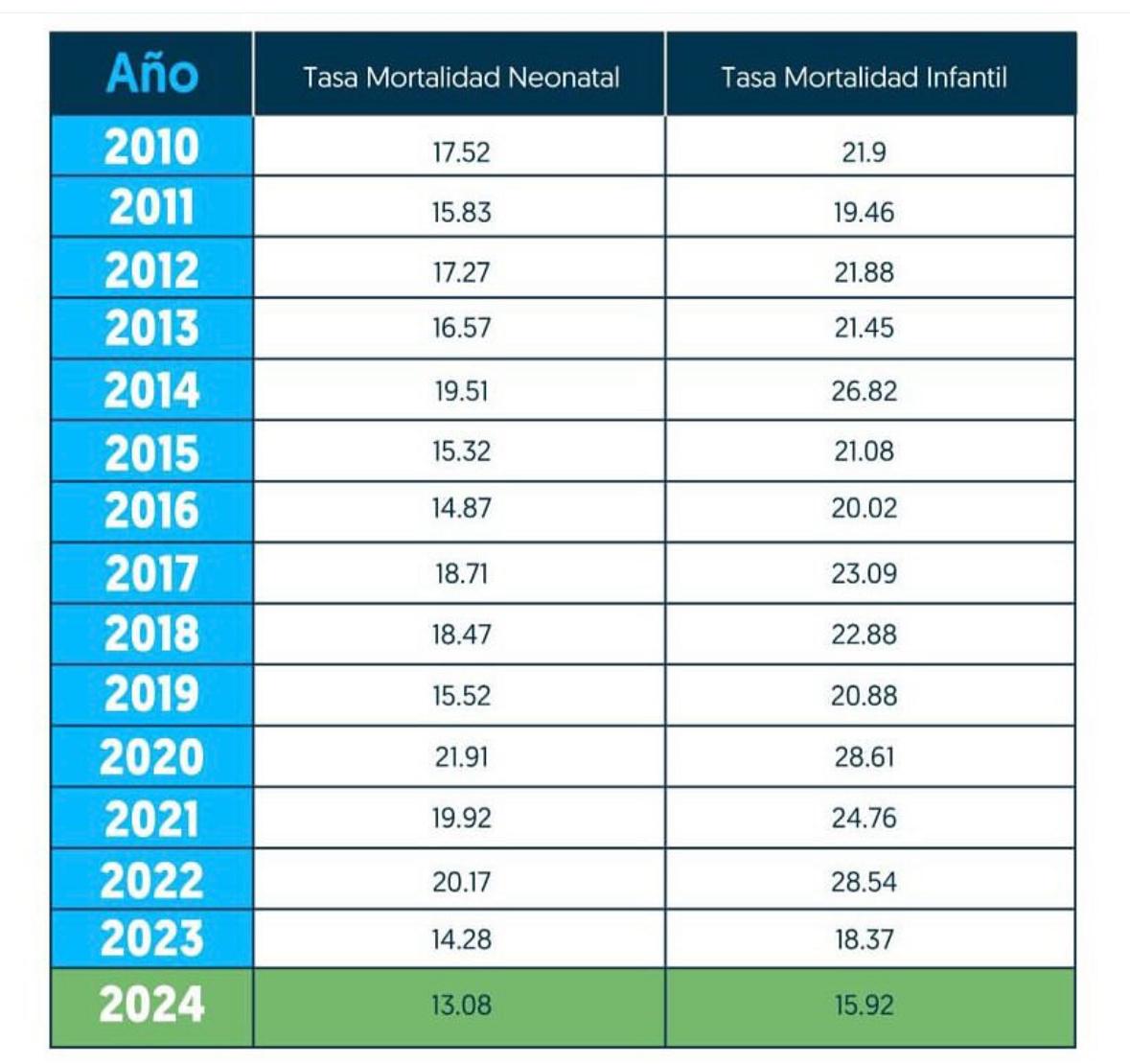 Las estadísticas que registra el SINAVE muestran que desde el 2010 hasta el 2024, las tasas de mortalidad neonatal han estado entre 14.28 en 2023 la más baja y 21.91 en el 2020 la más alta. Mientras que la de mortalidad infantil, la más baja antes del 2024 fue en 2023, con una tasa de 18.37 y la más alta, también en 2020 de 28.6.