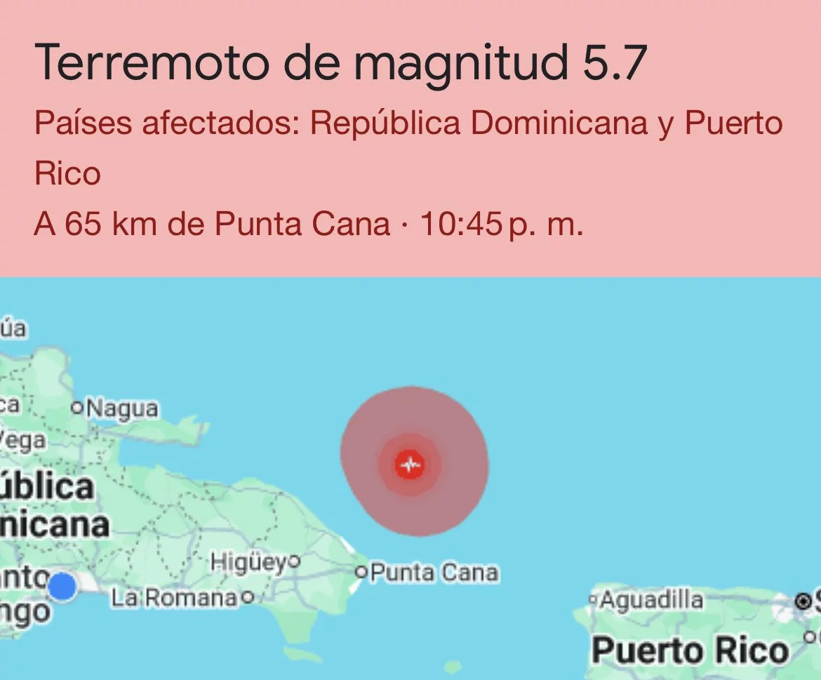 Un temblor de magnitud 5.7 se registró la noche de este lunes a 64 kilómetros noreste de Punta Cana, en la provincia La Altagracia, según el Servicio Geológico de Estados Unidos (USGS, por sus siglas en inglés).