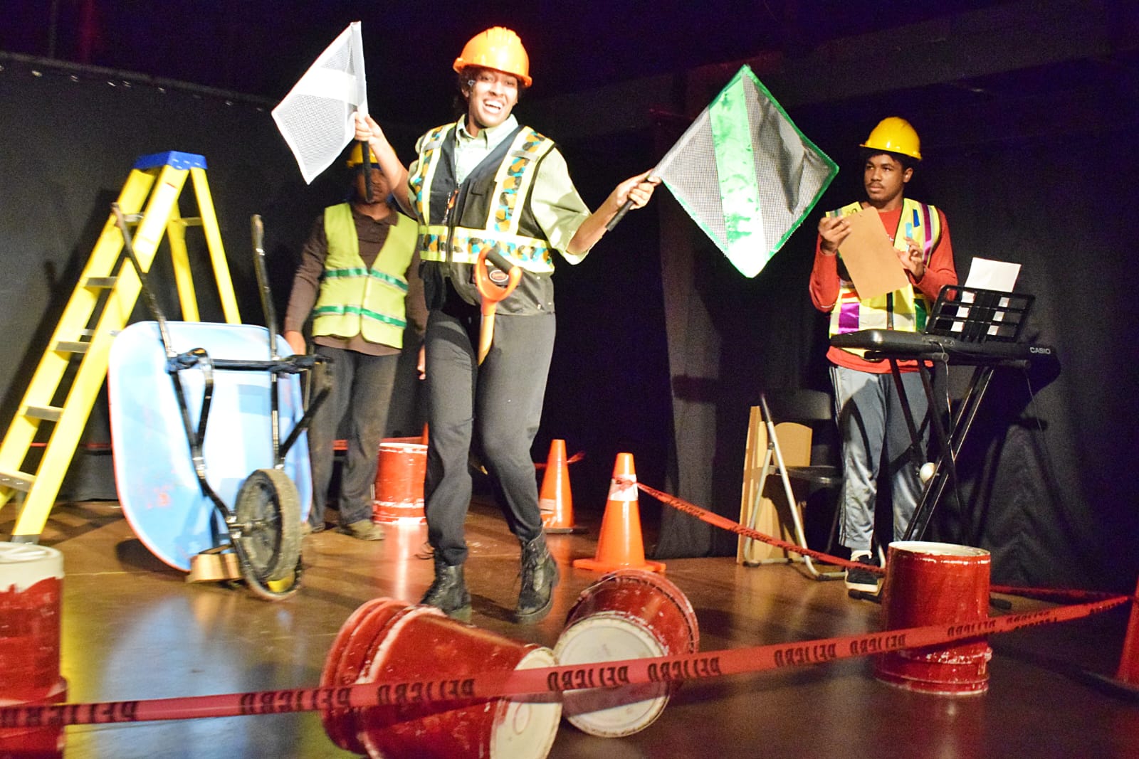 Cada elemento sobre el escenario —escaleras, bloques, cascos, herramientas— cobra múltiples significados: son la ambición del poder, el peso de la historia, los símbolos patrios y la investidura presidencial. El espacio escénico se convierte así en un espejo del país mismo: frágil, inacabado y profundamente humano.