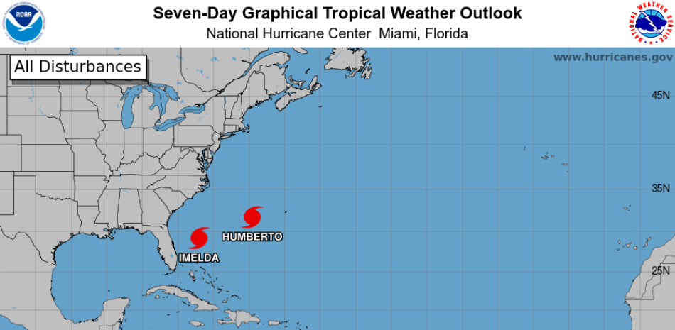 Entre tanto, la fuerza del huracán Humberto, que decreció a categoría 2 tras haber alcanzado un nivel 5 el fin de semana, atrajo a Imelda hacia el este, con lo que evitó impactar territorio estadounidense, pero el NHC advirtió de riesgos en las costas.