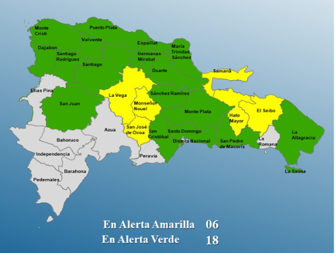 Mientras que en alerta verde están: Sánchez Ramírez, Valverde, Santiago Rodríguez, Montecristi, Dajabón, San Pedro de Macorís, Puerto Plata, San Juan, Santiago, Duarte, San Cristóbal, Distrito Nacional, Espaillat, Hermanas Mirabal, María Trinidad Sánchez, La Altagracia, Monte Plata y Santo Domingo.